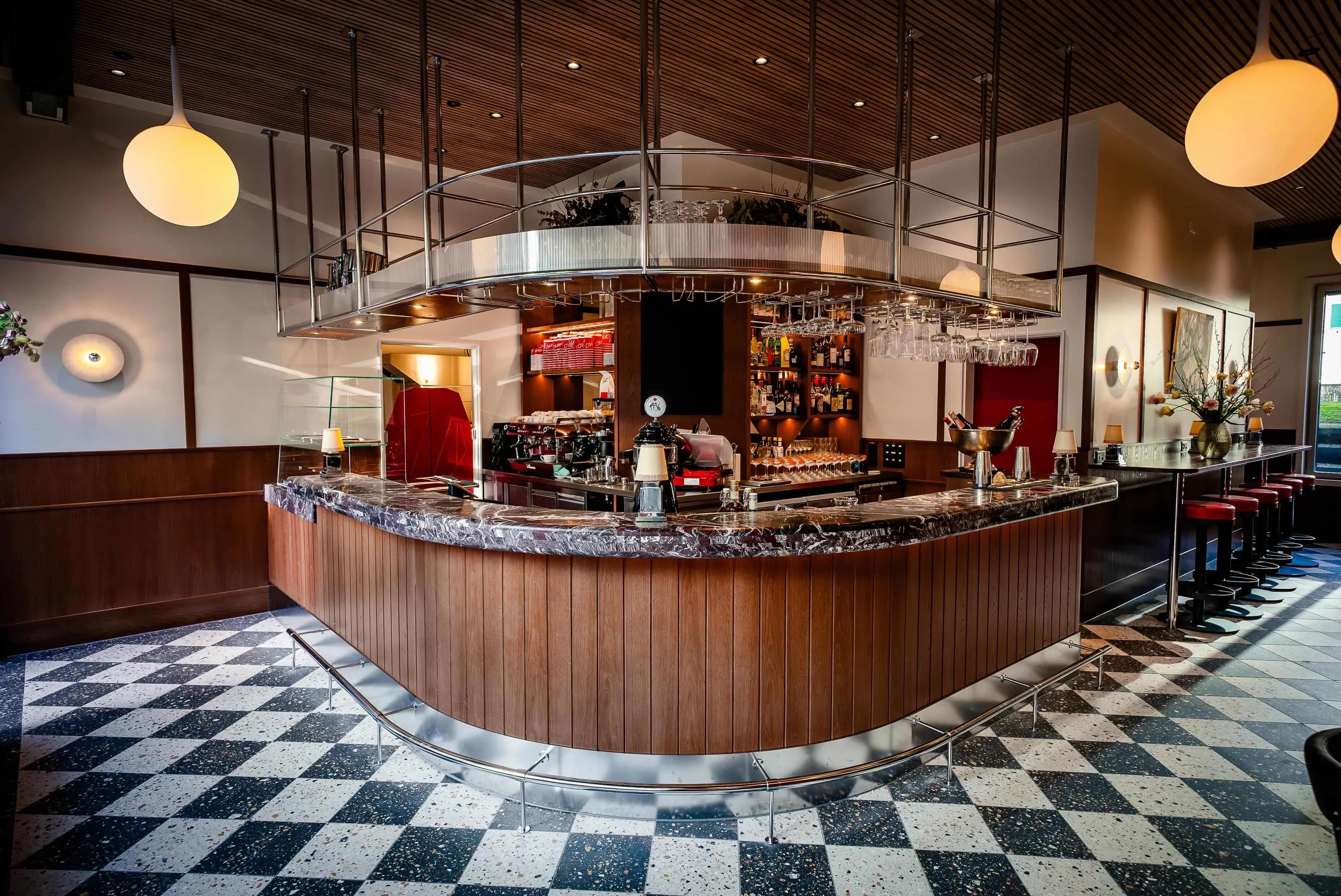 The checkered flooring introduces a strong geometric identity, referencing traditional café design while aligning with Zurich’s modern design culture. Suspended glass racks add vertical articulation, and the interior furnishment is arranged around the bar to reinforce spatial hierarchy.
